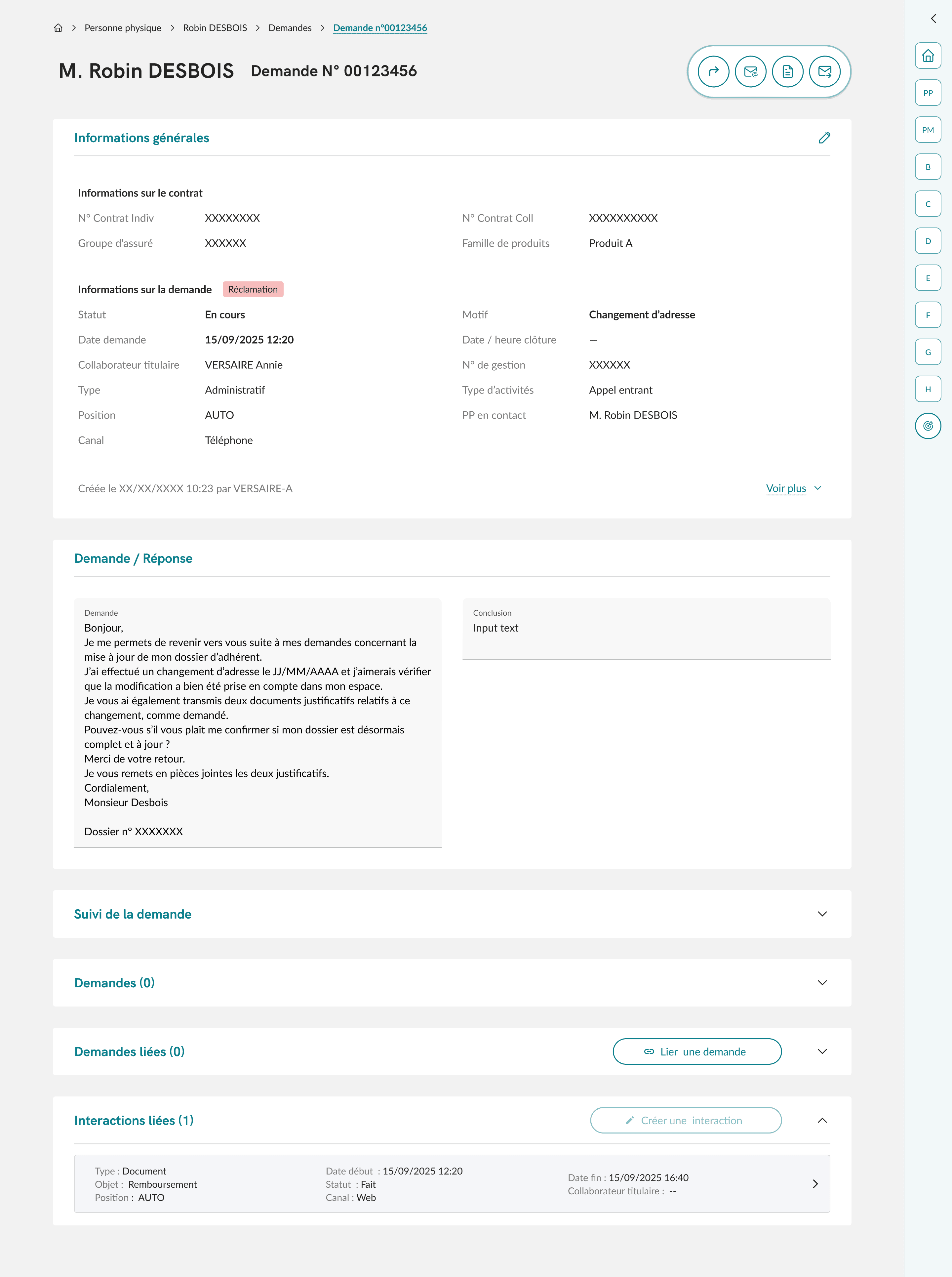 La refonte portait sur la page de consultation d'une demande adhérent sur le CRM, utilisée quotidiennement par 5+ profils métiers différents. L’objectif : réorganiser et simplifier l’affichage des informations pour améliorer la lisibilité, en s’appuyant sur une recherche utilisateur afin de répondre aux besoins spécifiques de chaque profil et réduire le temps de traitement.
