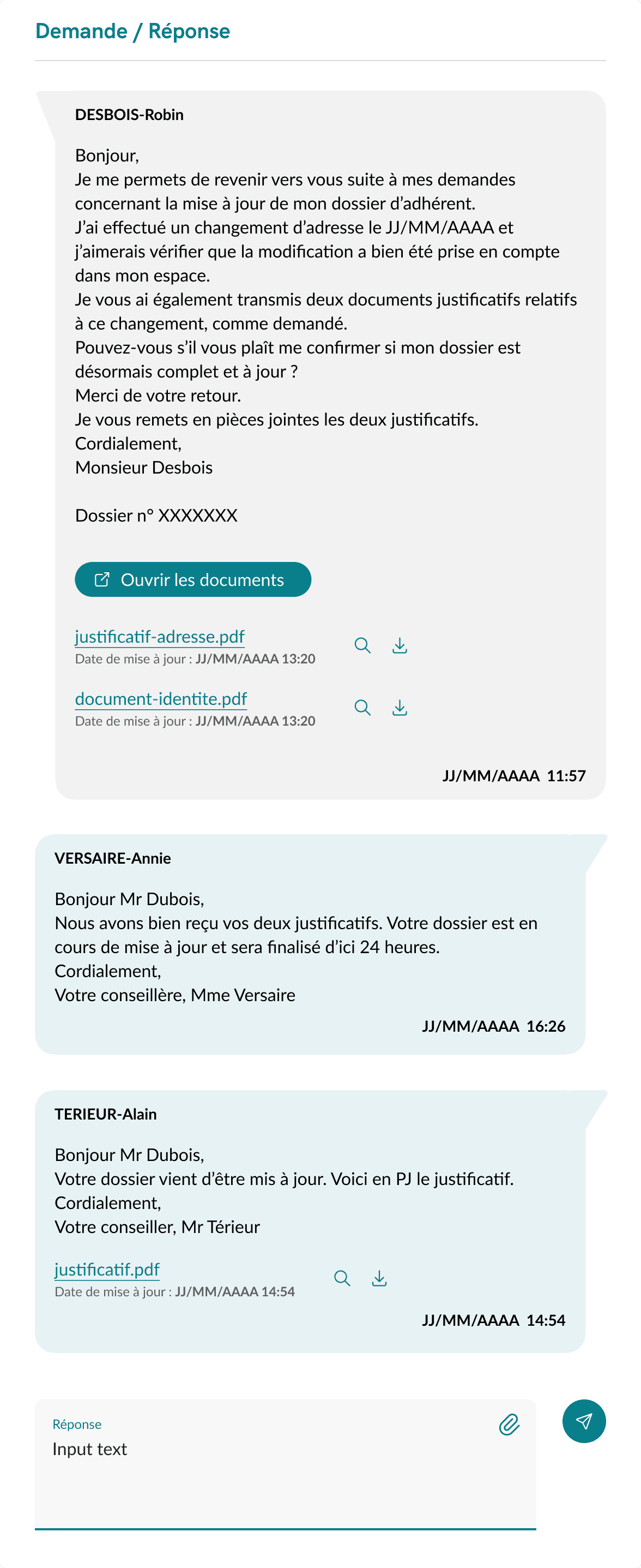 J’ai également fusionné les blocs “Demande/Réponse” et “Documents” afin de limiter les scrolls répétitifs mentionnés par les utilisateurs (50+ par jour), et ainsi améliorer le confort d’usage au quotidien.