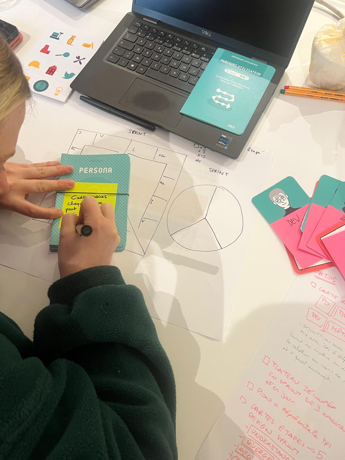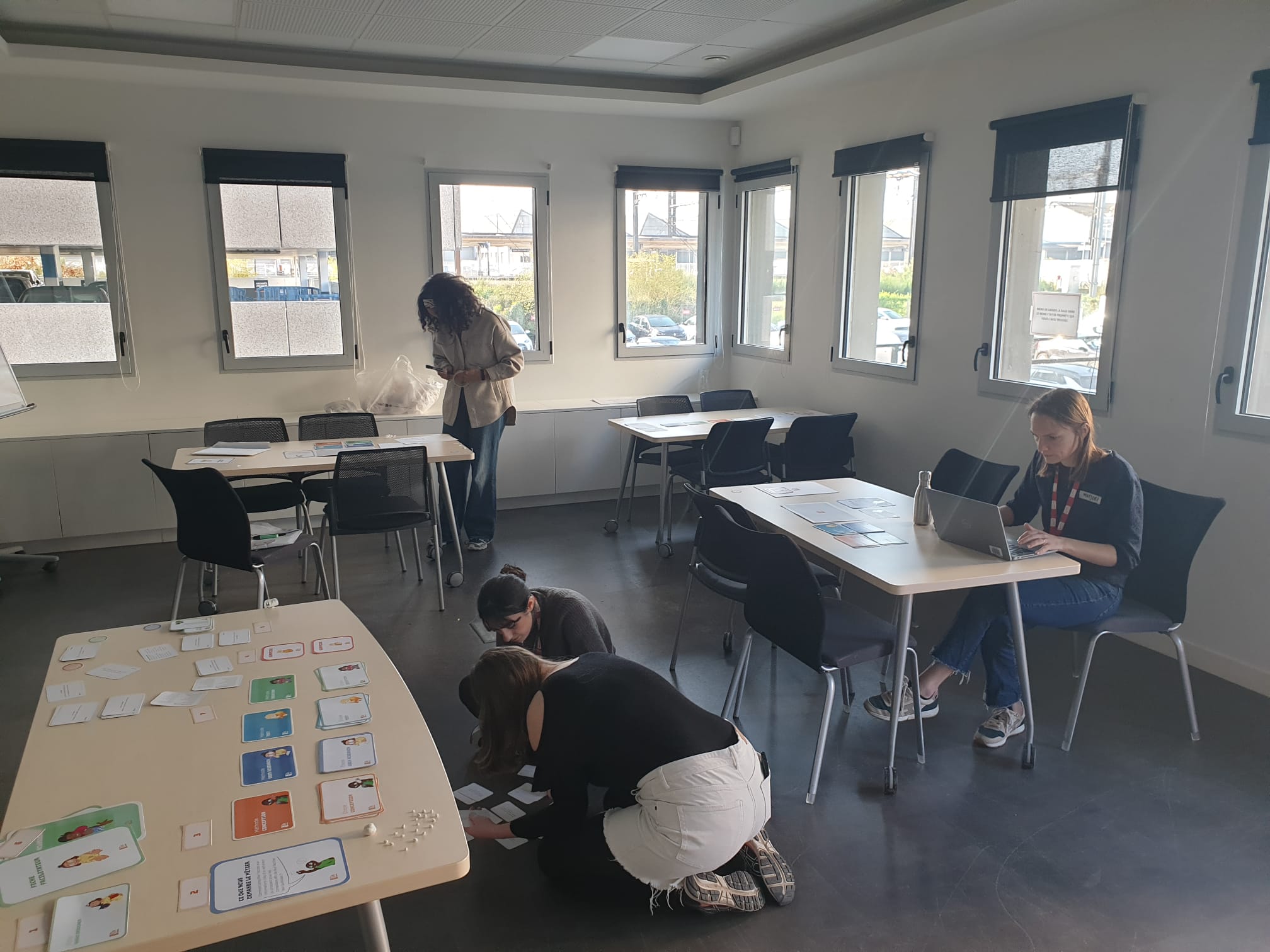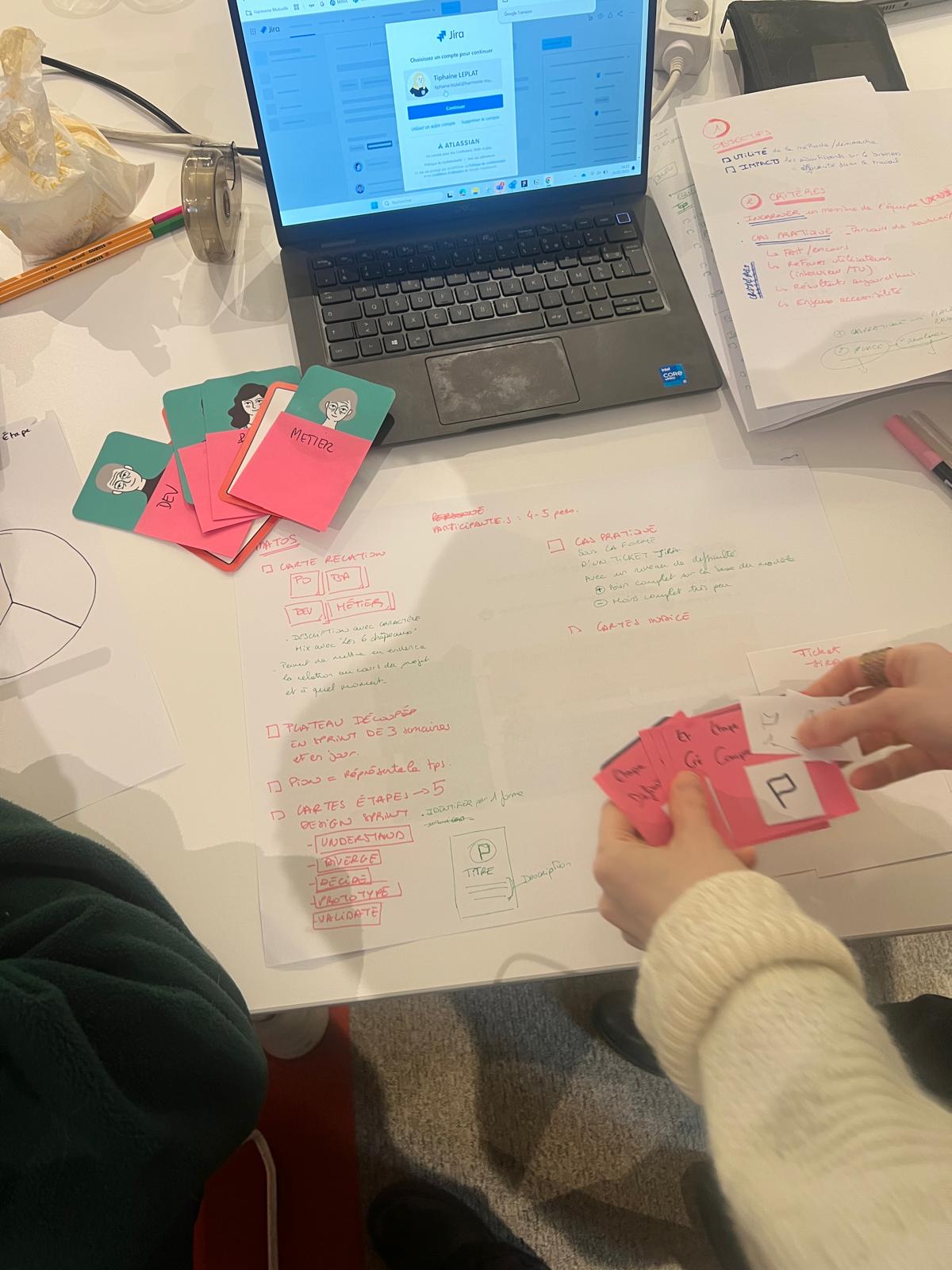 À partir de ces bases, Charlotte, notre UX Researcher, et Cléo, alors en stage dans l’équipe, ont pris en main la conception concrète de tout le matériel : cartes, supports, règles, déroulé de session… une vraie production créative et collaborative.